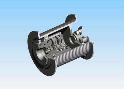 本减速机采用模块化设计,结构非常紧凑,可直接装在卷筒内。适用于工况条件恶劣,安装空间狭小,对减速机性能要求稳定完备,有低速大扭矩需求的任何卷扬系统。同时设计之初就预留了最高的安全裕度,渗碳后经过磨齿处理的齿轮和氮化处理的内齿圈使该减速机具有低噪音运转,长使用寿命的特点。